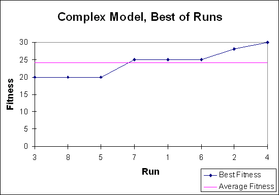 The three lowest fitness scores of 20 indicate that the program never learned not to send flow out of the sink node. The three scores of 25 indicate programs which learned not to send flow out of the sink, but were fooled by both the flow from the top node back into the source, and the flow from the top node into the middle node, where it cannot be effectively used.